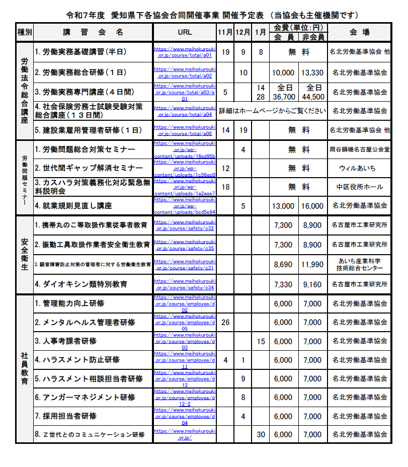 愛知県下各労働基準協会では労務管理研修や勉強会の共催事業を実施しています。実施機関は名古屋市内や他の地区協会ですが、当協会を通じてお申込みいただければ会員価格で受講することが可能です。